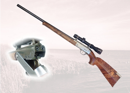 ist ein entfernter Verwandter von Lilliput long rifle (s.u.), eigentlich aber eine richtige Promenadenmischung aus altdeutscher hahnloser Jägerbüchse, Long Rifle und modernem Pressluftgewehr. Der für die 'Jagd' optimierte Tieflader (siehe Details) hat einen 'Schichtholzschaft' aus Holzresten (schützt den Regenwald), in dessen Vorderteil sichtbar das Reservoir und darunter unsichtbar der .22er Lauf mit 50 -70 Joule Leistung und excellentem Trefferbild untergebracht ist. Hier weitere Details.