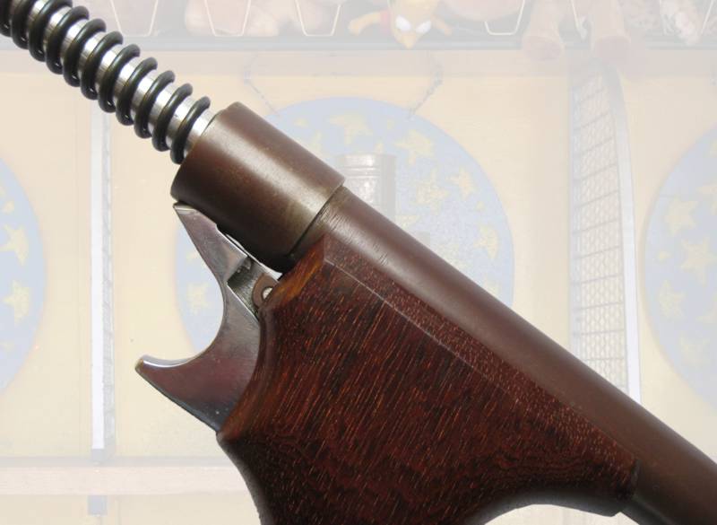 McAirrow BallaBalla_lt Der ursprüngliche Gedanke, ein Seitenspannerluftgewehr von der Stange entsprechend umzubauen, erwies sich als Schnapsidee. Zu kompliziert, in der Handhabung unbrauchbar, waffenrechtlich irgendwie nicht eindeutig und auch eine Designkatastrophe. Man muß wissen, daß in den Wurfbuden Lederbälle mit Sockenfüllung (ja, Ihr habt richtig gehört) verwendet werden, die ca. 100 Gramm wiegen. So entstand also McAirrow BallaBalla. Der Aufbau ergibt sich vollständig aus dem Foto und bedarf wohl keiner weiteren Beschreibung. Da kein Geschoß durch einen Lauf getrieben wird, unterliegt BB nicht dem Waffenrecht. Die Druckfeder beschleunigt gelochte Bälle (50 - 100 Gramm) auf ca. 12 m/s (< 7.5 Joule). Das ist eine mittlere "Kirmeswurfgeschwindigkeit". Wegen des hohen "Munitonsgewichtes" entsteht trotz der geringen Geschwindigkeit ein spürbarer Rückstoß. Das Schießen macht wirklich Spaß. BB ist 75 cm lang und wiegt leer 1000 Gramm.