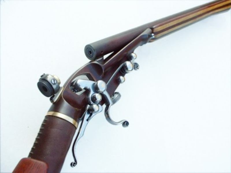 HowStuffworks - mit geöffnetem System In den dünnwandigen sichtbaren Laufmantel wurde ein auch nach heutigen Maßstäben hochwertiger gezogener Lauf geringen Durchmessers eingespannt. So blieb wohl ein zusätzliches Volumen mit einer Art 'Lärmschutzfunktion'. Das Prinzip 'Spannbeton' verstieße heute natürlich gegen das moderne Dogma des spannungsfrei montierten Laufs. Ebenso erfüllt das verwinkelte und konstruktionsbedingt relativ große 'Lost Volume' im Transferport keine modernen Wünsche. Allerdings wurde der Transferport für mich überraschend schon damals mit einer Einstellschraube zur Querschnittsreduzierung ausgestattet. Für den modernen Wettkampfschützen nicht wirklich vertrauenerweckend erscheint sicher auch der direkt auf den Hahn wirkende Abzugshaken mit kilometerlangem Weg. Unser Wettkampfschütze findet indes als kleine Wiedergutmachung eine brauchbare Visierung mit einfachem Diopter und Korntunnel.