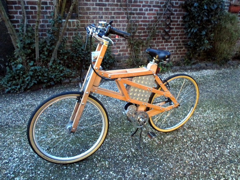 2017 Der rollende Holländer Hier habe ich ein uraltes Hollandrad mit Nabenschaltung (15 €) vollkommen "entkernt", den Rahmen in Canyonrot lackiert und um einen Motorantrieb ergänzt. Als quasi "Mittelmotor", der auf das mechanische Getriebe wirkt, fungiert ein 250 W / 24 Volt Getriebemotor des Typs MY1016Z (70 €) von Happy-Motorparts. Hier passt die Drehzahl perfekt zu den gegebenen Bedingungen (max 25 km/h). Das existierende Kettenrad wurde auf einen Standardfahrradfreilauf montiert und um ein zweites Kettenrad ergänzt, das wiederum mit einem Freilauf versehen ist. In dieser Konstruktion sind beide Kettenräder auf der rechten Seite. Dazu mußte allerdings die Achse des Standardtretlagers um 15 Millimeter verlängert werden. Daher gab es Probleme mit der Kettenlinie, so daß ich das hintere Ritzel stark nach außen kröpfen mußte. Der Softpackakku steckt in der dunklen Sperrholzbox, die Motorsteuerung (25 €) in der kleinen, roten Blechbox. Am Ende ist die "rote Helene" nun ein "Naked Bike", das mir bereits jetzt sehr viel Spaß gemacht hat.