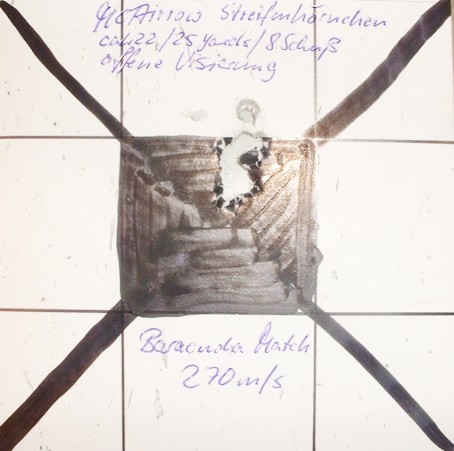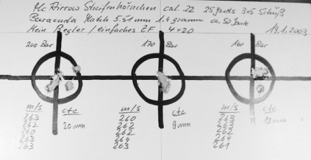 | McAirrow Chipmunk auf dem Schiessstand nach einigen Schlagstückvariationen zwischen 50 und 70 Joule stellte sich die 50 Joule Einstellung als überaus sortentolerant heraus, was die Treffpunkte der unterschiedlichen Diabolos (cal. 22 FT, Baracuda, koreanisch ...) anbelangt. Außerdem ergab sich hier eine extrem konstante V1 zwischen 260 m/s und 264 m/s ![]() |