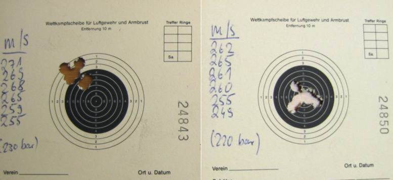 Schon nach kurzer Zeit war ich mit den Ergebnissen recht zufrieden: Mit 230 bar Anfangsdruck flogen sechs koreanische Rundköpfe (ca. 30 grain) aufgelegt und ohne Optik immer wieder in Streukreise um die 12 mm ctc. Darin ist die Waffen- und die Schützenstreuung (keine Optik, 'Altersblindheit') enthalten. Die erste Trommel liefert bei einem Verbrauch von ca. 1 l Luft je Schuß eine zufriedenstellend konstante Leistung von ca. 60 Joule . Ohne Frischluft bringt dann die zweite Trommel noch etwa 55 bis 40 Joule. Besorgt um oHenry's Silhouette konnte ich hier natürlich nur ein vergleichsweise dünnes Rohr als Presslufttank (120 ccm) verwenden. |