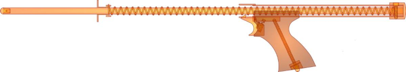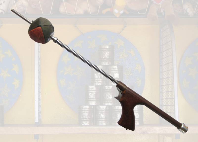 McAirrow BallaBalla_lt Der ursprüngliche Gedanke, ein Seitenspannerluftgewehr von der Stange entsprechend umzubauen, erwies sich als Schnapsidee. Zu kompliziert, in der Handhabung unbrauchbar, waffenrechtlich irgendwie nicht eindeutig und auch eine Designkatastrophe. Man muß wissen, daß in den Wurfbuden Lederbälle mit Sockenfüllung (ja, Ihr habt richtig gehört) verwendet werden, die ca. 100 Gramm wiegen. So entstand also McAirrow BallaBalla. Der Aufbau ergibt sich vollständig aus dem Foto und bedarf wohl keiner weiteren Beschreibung. Da kein Geschoß durch einen Lauf getrieben wird, unterliegt BB nicht dem Waffenrecht. Die Druckfeder beschleunigt gelochte Bälle (50 - 100 Gramm) auf ca. 12 m/s (< 7.5 Joule). Das ist eine mittlere "Kirmeswurfgeschwindigkeit". Wegen des hohen "Munitonsgewichtes" entsteht trotz der geringen Geschwindigkeit ein spürbarer Rückstoß. Das Schießen macht wirklich Spaß. BB ist 75 cm lang und wiegt leer 1000 Gramm.