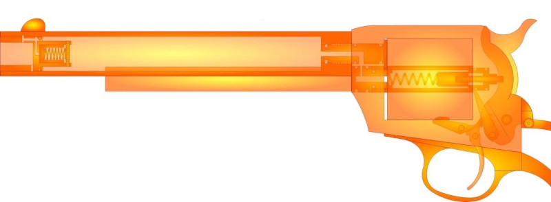 McAirrow Flycatcher Systemskizze Flycatcher ist ein .177 Pressluft-SA-Revolver, wiegt 1.4 kg und mißt ca. 35 cm. Tankvolumen, Ventilquerschnitte und Undichtigkeiten habe ich so ausgelegt, daß das bißchen Luft für etwa 4 Trommeln a 6 Schuß reicht. Alle Schüsse hätten, wenn ich denn eins hätte, ein F im Fünfeck.