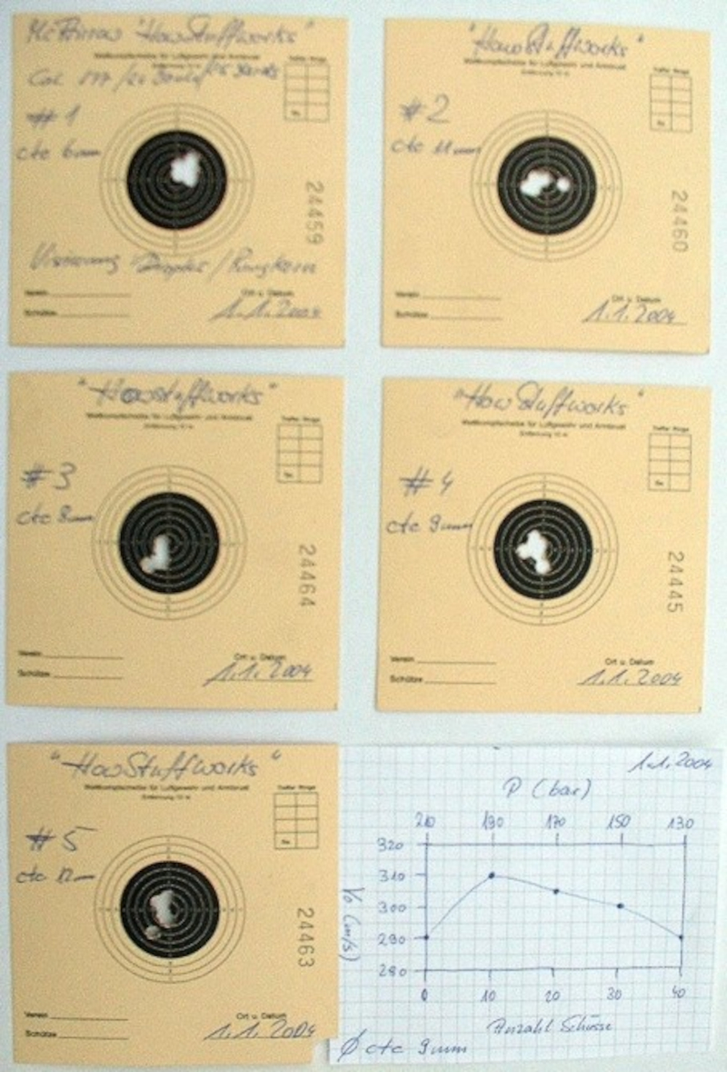 HowStuffworks auf dem Schiessstand (25 Yards) Nach nur wenigen Tests und Einstellarbeiten beließ ich es bei der 22-25 Joule-Einstellung. Die Ergebnisse sind angesichts meiner Sehkraft, der einfachen Visierung sowie der primitiven Abzugsmimik vollkommen überzeugend. Eine Füllung liefert 40 gute Schüsse zischen 290 und 310 m/s. 25 davon seht Ihr unten: Howstuffworks erzielt ohne Optik mit Schulz-Diabolos jederzeit wiederholbar 5er-Gruppen zwischen 6 und 12 mm ctc. Darin sind meine körperlichen Einschränkungen bereits enthalten. Am Ende bleibt unklar, ob die excellenten Resultate in Sachen Präzision trotz oder gerade wegen der diversen Verstöße gegen heutige Konstruktionsprinzipien zustande kommen. Das Gesamturteil des englischen Königshauses hätte jedenfalls wohl lauten können: We are really amused. |