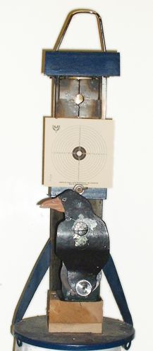 Dies und das - meine 'Outdoor'-Lösung Aus diversem Schrott (Bügelmaschine, Plattenspieler usw. ) entstand mein 'stummer Diener' für die 35 Yard Distanz auf meinem Innenhof. Der enthält eine Wackelzielscheibe, die Befestigungsmöglichkeit für eine normale Zielscheibe und einen .... ![]() ... Klappraben mit besonderem : |