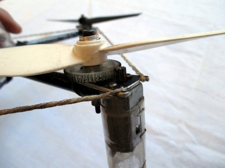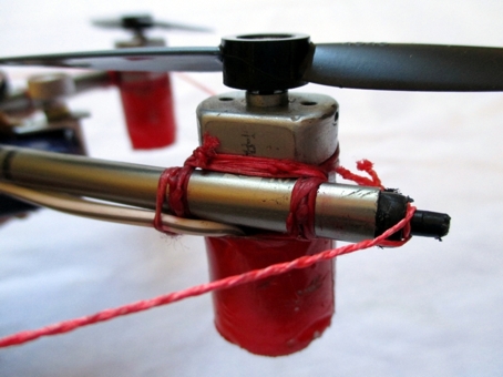 Motorbefestigung 2 mit Spannschnur Hier sind die Motoren lediglich mit Bogensehne an die abgeflachte Seite eines Aluröhrchens (Pfeilschaft) angewickelt / angeknotet. Eine überraschend einfache und stabile Lösung.