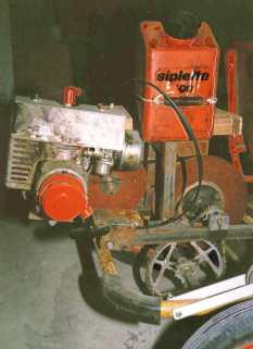 1985 ff - Rasenmähermotor mit Getriebe aus hölzernen Riemenscheiben Peter Davids und ich haben dieses Teil mit viel Vergnügen in meiner Werkstatt gebaut und getestet