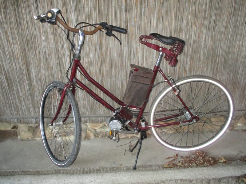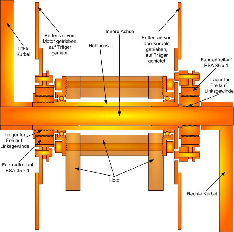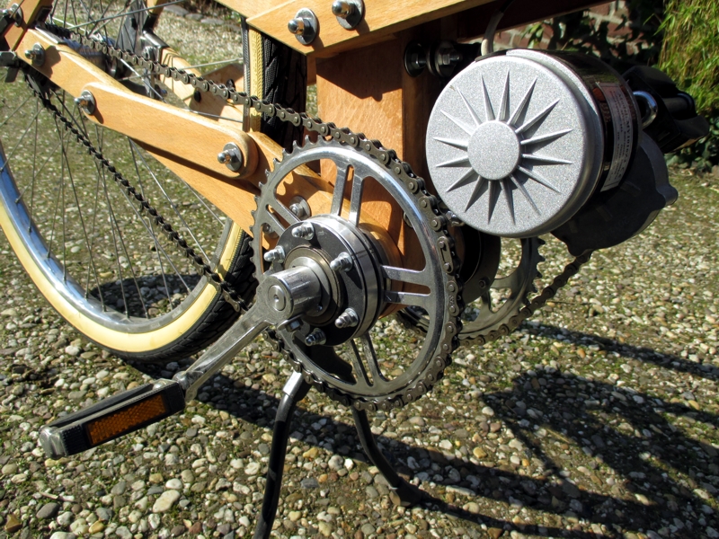 2017 Der rollende Holländer Hier habe ich ein uraltes Hollandrad mit Nabenschaltung (15 €) vollkommen "entkernt", den Rahmen in Canyonrot lackiert und um einen Motorantrieb ergänzt. Als quasi "Mittelmotor", der auf das mechanische Getriebe wirkt, fungiert ein 250 W / 24 Volt Getriebemotor des Typs MY1016Z (70 €) von Happy-Motorparts. Hier passt die Drehzahl perfekt zu den gegebenen Bedingungen (max 25 km/h). Das existierende Kettenrad wurde auf einen Standardfahrradfreilauf montiert und um ein zweites Kettenrad ergänzt, das wiederum mit einem Freilauf versehen ist. In dieser Konstruktion sind beide Kettenräder auf der rechten Seite. Dazu mußte allerdings die Achse des Standardtretlagers um 15 Millimeter verlängert werden. Daher gab es Probleme mit der Kettenlinie, so daß ich das hintere Ritzel stark nach außen kröpfen mußte. Der Softpackakku steckt in der dunklen Sperrholzbox, die Motorsteuerung (25 €) in der kleinen, roten Blechbox. Am Ende ist die "rote Helene" nun ein "Naked Bike", das mir bereits jetzt sehr viel Spaß gemacht hat.