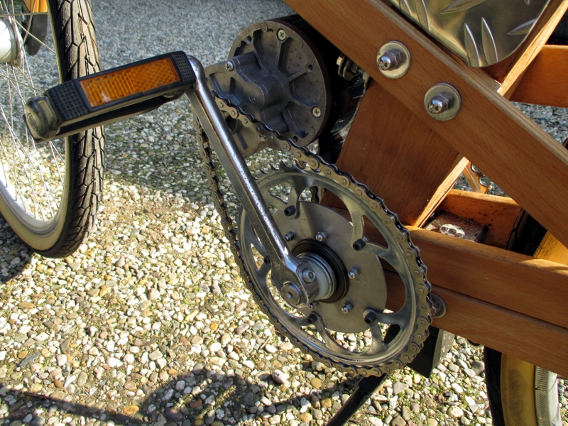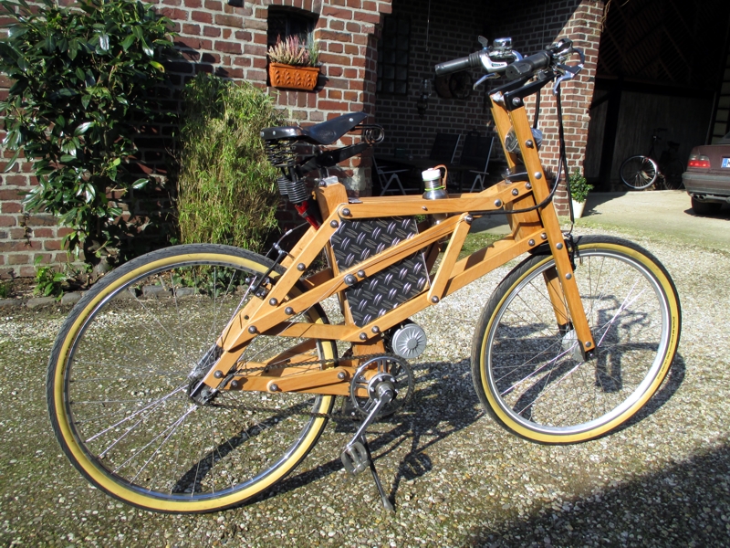 2018 Der Lattenesel - von links Nun hatte ich gewissermaßen Blut geleckt. Das nächste Projekt sollte eine weitgehend eigene Konstruktion aus Holz sein. Aus einem weiteren günstigen Gebrauchtrad, einem übrig gebliebenen Lattenrost aus mehrfach verleimten Buchenlatten und den Antriebskomponenten aus dem "rollenden Holländer" entstand mein "Lattenesel", bei dem nun auch das Tretlager eine Eigenkonstruktion ist, die die Nachteile des Holländers vermeidet. Für Interessierte habe ich eine kleine Skizze dazu angehängt. Softpackakku und Motorsteuerung befinden sich übrigens im Riffelblechkasten.