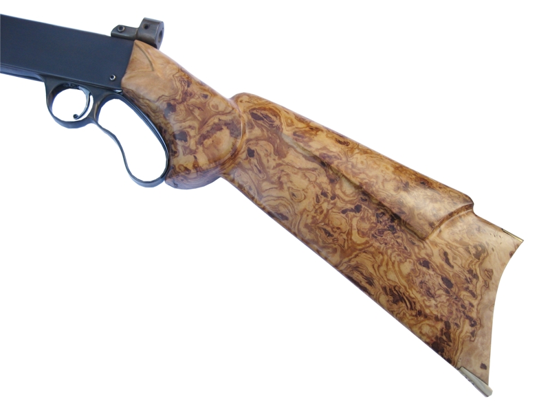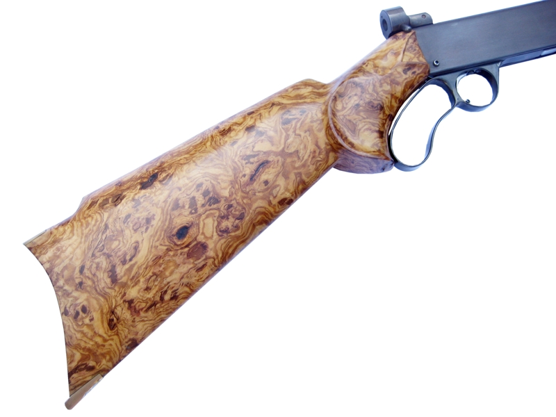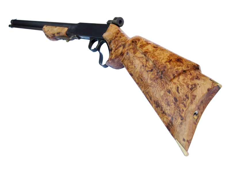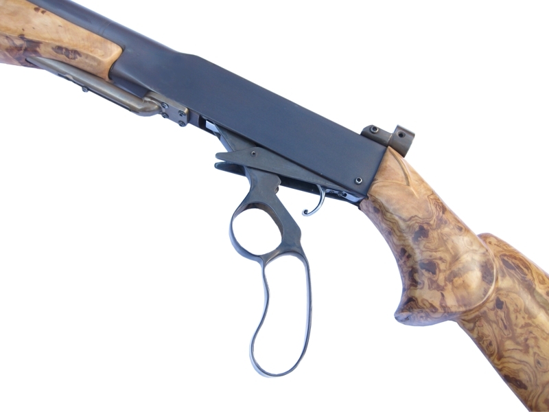 McAirrow 'Rugby' mit teilweise geöffnetem System. Der Öffnungswinkel des Unterhebels beträgt insgesamt ca. 110 Grad. Diese große Untersetzung war erstens wegen des langen Schlagstückwegs bei starker Feder (Kaliber .32) erforderlich, vor allem aber, um die Rundkugel auf den letzten Millimetern mit wenig Kraft sauber in die Züge setzen zu können. Beim Repetieren ist also sportlicher Elan gefragt: Im Anschlag reicht die Armlänge nicht. Die langweilige Möglichkeit besteht nun darin, 'Rugby' nach dem Schuß abzusetzen und zu repetieren. In der sportlichen Variante schwingt Ihr das Gewehr nach dem Schuß überkopf in eine zum Repetieren geeignete Position und geht dann wieder in den Anschlag. Wirklich fotogen ist dieses Gewirbele nicht, deshalb gibt es dazu auch keine Fotos.