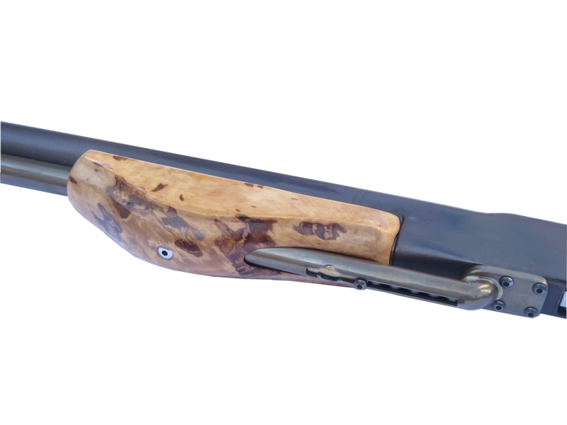 McAirrow 'Rugby's Systemkasten sowie sämtliche Teile habe ich aus Stahl gemacht und mit einer bräunierten / bronzierten Oberfläche versehen. Lothar Walther lieferte den Lauf. Besonders gefällt mir der Schaft aus einer Olivenmaserknolle. Dieses Holz habe ich erstmalig verarbeitet und begeistert mich: Ihr müßt es nur in Form bringen, schleifen und trocken polieren. Weder ist das Schließen von Poren nötig noch braucht ihr irgendein Poliermittel, da dieses als Olivenöl bereits ausreichend im Holz vorhanden ist. Die reichlich enthaltenen ungesättigten Fettsäuren im Holz sorgen außerdem beim Schießen wegen des engen Hautkontaktes für eine gesunde Regulierung Eures Cholesterinspiegels - gut, den letzten Satz nehme ich zurück.