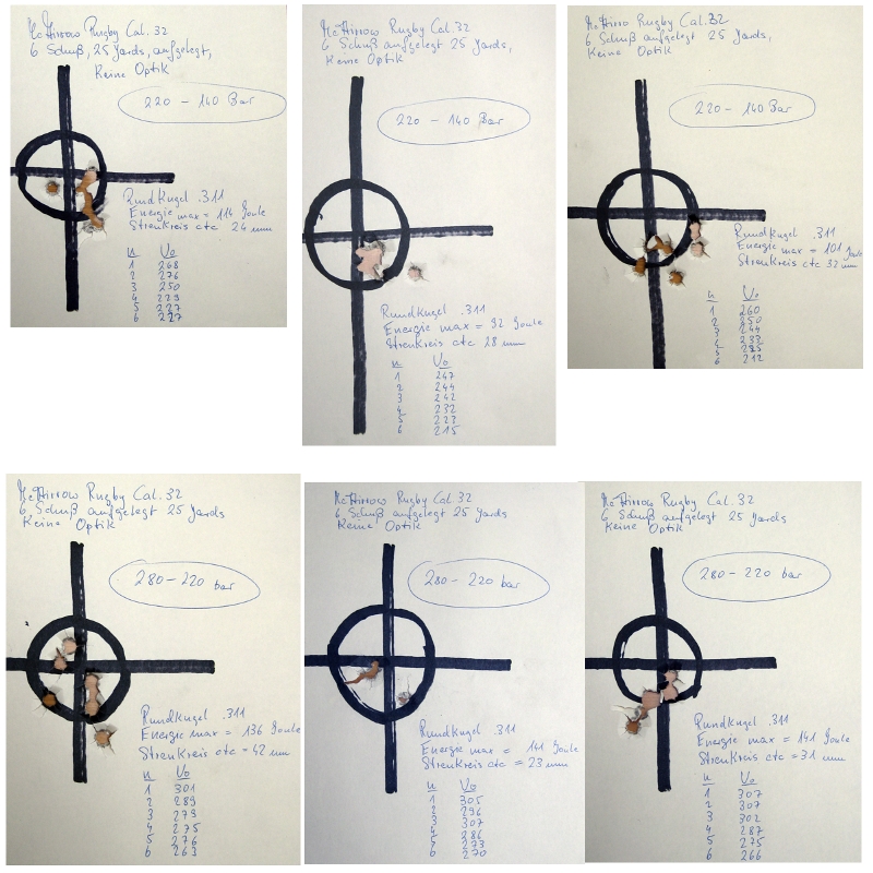Aus mehreren Gründen habe ich bei diesem Projekt keine Spitzenpräzision erwartet: Bisher habe ich keinerlei Erfahrung mit Rundkugeln sammeln können. Schon der Rundkugel an sich mangelt es ja wohl an Präzision gegenüber anderen Geschoßformen. Hinzu kommt, daß Rugby die Rundkugel nicht wie der Vorderlader in einem Pflaster verschießen kann und deshalb die zufällige Position der Angußstelle im Lauf für eine ungleiche Zentrierung sorgt. Vermutlich ist auch der Drall des Laufes für Rundkugeln zu kurz. Jeden, der einen guten Vorschlag in Sachen Verbesserung des Trefferbildes machen kann, würde ich natürlich in mein Abendgebet einschließen. Die Ergebnisse sind dennoch nicht so schlecht: Ohne Optik ergeben sich auf 25 Yards in der 100 Joule-Einstellung Streukreise von 25 bis ca. 30 mm ctc. Bei Volldampf (140 Joule) weitet sich das Trefferbild noch etwas. Wohl wegen der hohen Haft- und Gleitreibung der Rundkugel im Lauf war für 'Volldampf' ein höherer Pressluftdruck erforderlich.