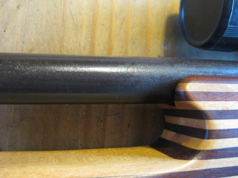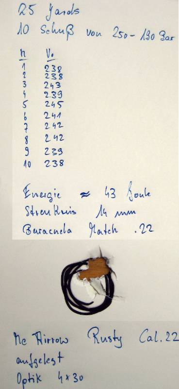 Mit einer LP-Alukartusche liefert Rusty zwischen 250 und 190 bar zehn wirklich gute Schüsse in der Taubenklasse (ca. 40 Joule). Die .22er Baracudas (ca. 1.5 g) streuen 14mm ctc auf 25 Yards. Bei Nutzung eines größeren Druckbereichs (300 - 150 bar) gibt es etwa 30 Schüsse, die dann mit einer V0 von 220 - 240 -220 m/s den Lauf verlassen und etwas weiter streuen (25mm ctc). Ihr seht bei Rusty die gegen bewährte Prinzipien verstoßende, lärmberuhigte Spannlaufkonstruktion aus 'Howstuffworks'. Was ich hier nicht verrate, ist, daß Rusty sich längere Zeit standhaft weigerte, eine akzeptable Präzision abzuliefern. Nur eine ausdauernde Variation der Laufspannung mit Drehmomentschlüssel konnte unser Sensibelchen am Ende überzeugen. |