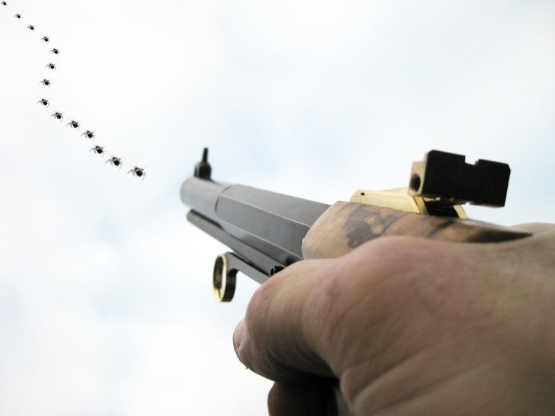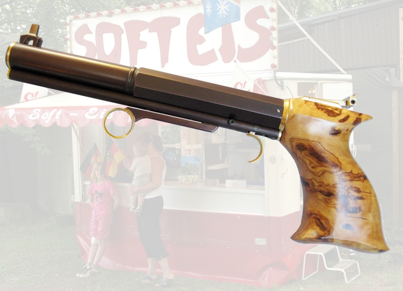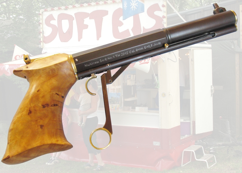 McAirrow Softy No. 1 Mir gefällt Madam's Retrokleid jedenfalls. Die Kombination aus fein bräuniertem Stahl, hochglanzpoliertem Messing und dem Griff aus an ungesättigten Fettsäuren reicher Olivenmaserknolle gibt ein Gefühl von Wert und mediterranem Flair. Ok, jetzt wirds schnulzig... Softy No. 1 ist angenehm kopflastig und liegt sehr gut in der Hand. Mit präzisem Messinglauf (5,96 mm) und verstellbarem Hopplahop (Gummirundschnur 3,5mm) macht das Schießen in der Wohnung auch auf 10 Meter Distanz noch richtig Spaß, auch wenn die Streukreise angesichts geringer Energie, glattem Lauf und kugelförmiger Geschosse natürlich nicht mit denen erwachsener Pressluftwaffen zu vergleichen sind. Übrigens brauchts einen Hubraum von <= 7 ccm, um bei 10 cm Lauflänge eine 0,2 Gramm Erbse auf 70 m/s zu beschleunigen.