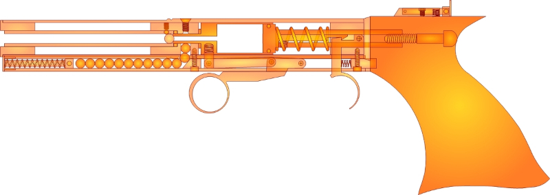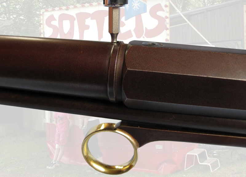 McAirrow Softy No. 1 von rechts mit gespanntem Kolben. Weich und mühelos spannt der Unterhebel den Kolben und repetiert die nächste Erbse in den Lauf. Trotz sehr einfacher Konstruktion des Magazins und der Sicherung der Erbse (eine nur 0,2mm tiefe Mulde im Lauf gegenüber der Mündung des Magazinkanals sichert die Kugel gegen seitliches Verrutschen) gab es bei hunderten von Schüssen nicht einen Klemmer...
