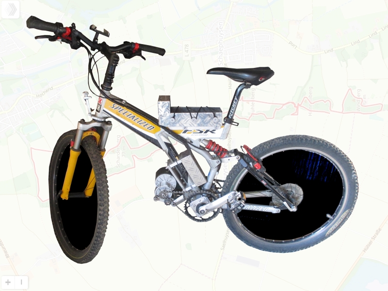 Dieses gut erhaltene Fully konnte ich günstig erwerben und habe es inzwischen mit einem kräftigen Rollermotor my1016z sowie dem Lattenesel-Antrieb ausgestattet. Auch auf wirklichen Buckel-Pisten muß der alte Mann nun nicht mehr aus dem Sattel und wird untenrum tatkräftig unterstützt.