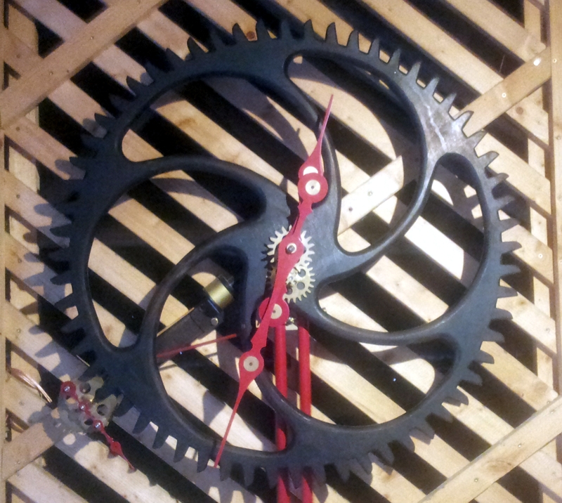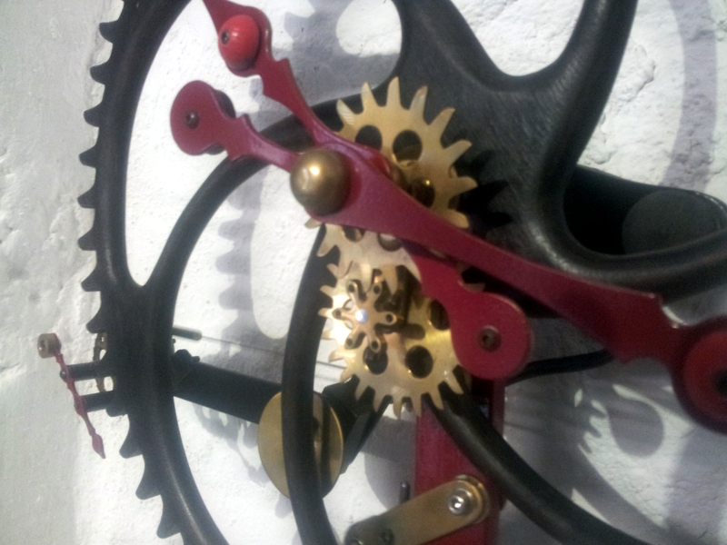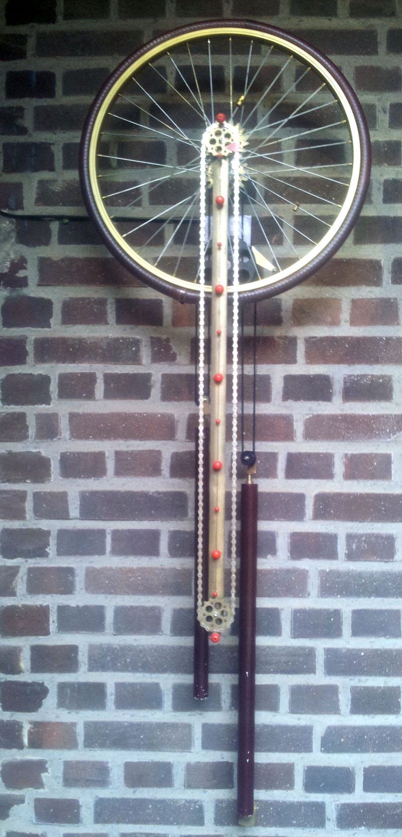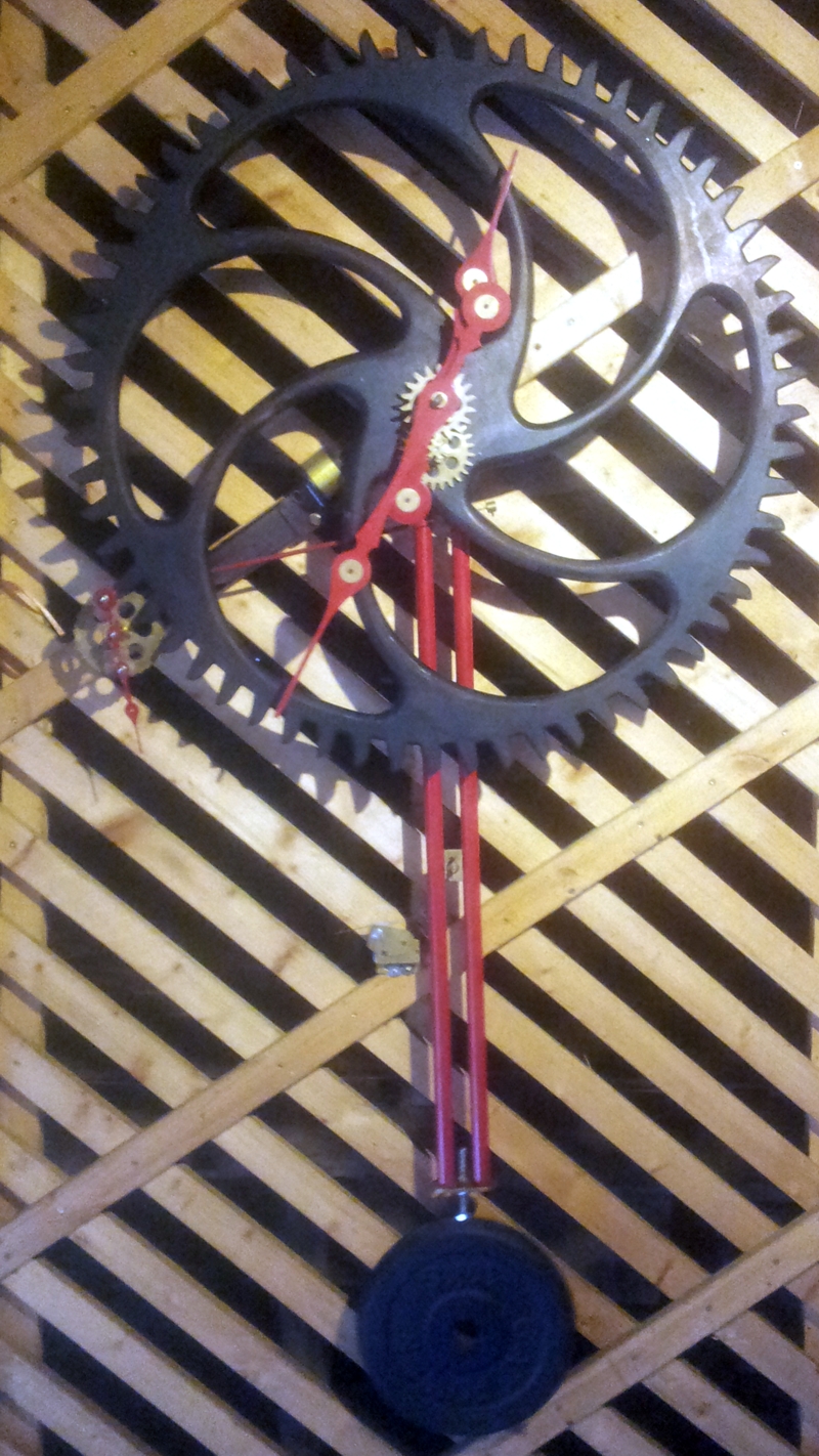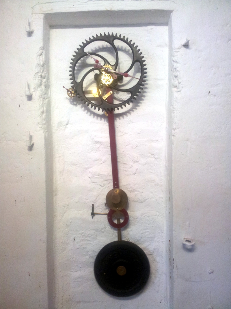 Die "Turmuhr" aus März 2014 hatte Anfang 2016 Fernweh bekommen und war von Kerken nach Wegberg umgezogen. Deshalb hat eine wahre "Größe" nun ihren Platz eingenommen: Das Schichtholzrad der #13 (Kosename: Die rote Helene) hat einen Durchmesser von beinahe einem Meter. Wie bei #10 sorgt der Elektroantrieb für einen sehr genauen Gang: Der Hippschalter gibt ca. einmal pro Minute einen kurzen Impuls auf einen Elektromagneten, der mittels Hebel das etwa 10 Kilogramm schwere Pendelgewicht in Gang hält. Ein vom Pendel angetriebenes Sperrrad stellt das große Stundenrad je Minute um einen Zahn weiter. Wie gehabt, folgt darauf eine kleine 3 x 4 Übersetzung zum Antrieb der Zeiger, die nun seit einem Jahr verläßlich die Zeit bestimmen.